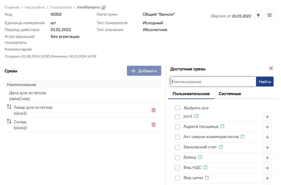 Для каждого показателя можно указать нужные срезы, — то есть измерения, по которым будут детализироваться данные.