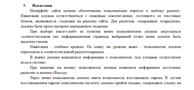 Это подраздел нужен для описания возможностей навигации в разрабатываемой программе. Расписывают местоположение и вид различных меню (и подменю) и их функции, например, переход при клике на ссылку или кнопку на другую страницу. если предполагаются навигационные цепочки или другие отдельные элементы навигации, то их функции прописывают тоже в данном подразделе.