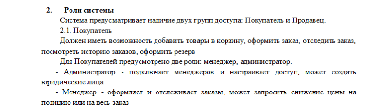 Подраздел посвящен распределению ролей, например, администратор, пользователь, покупатель и т. д. Здесь важно описать пользовательские сценарии для формирования требований к системе, включая быструю авторизацию и удобный доступ к данным. Каждому типу пользователя присваивается определенный статус (роль) и уровень доступа к возможностям системы.