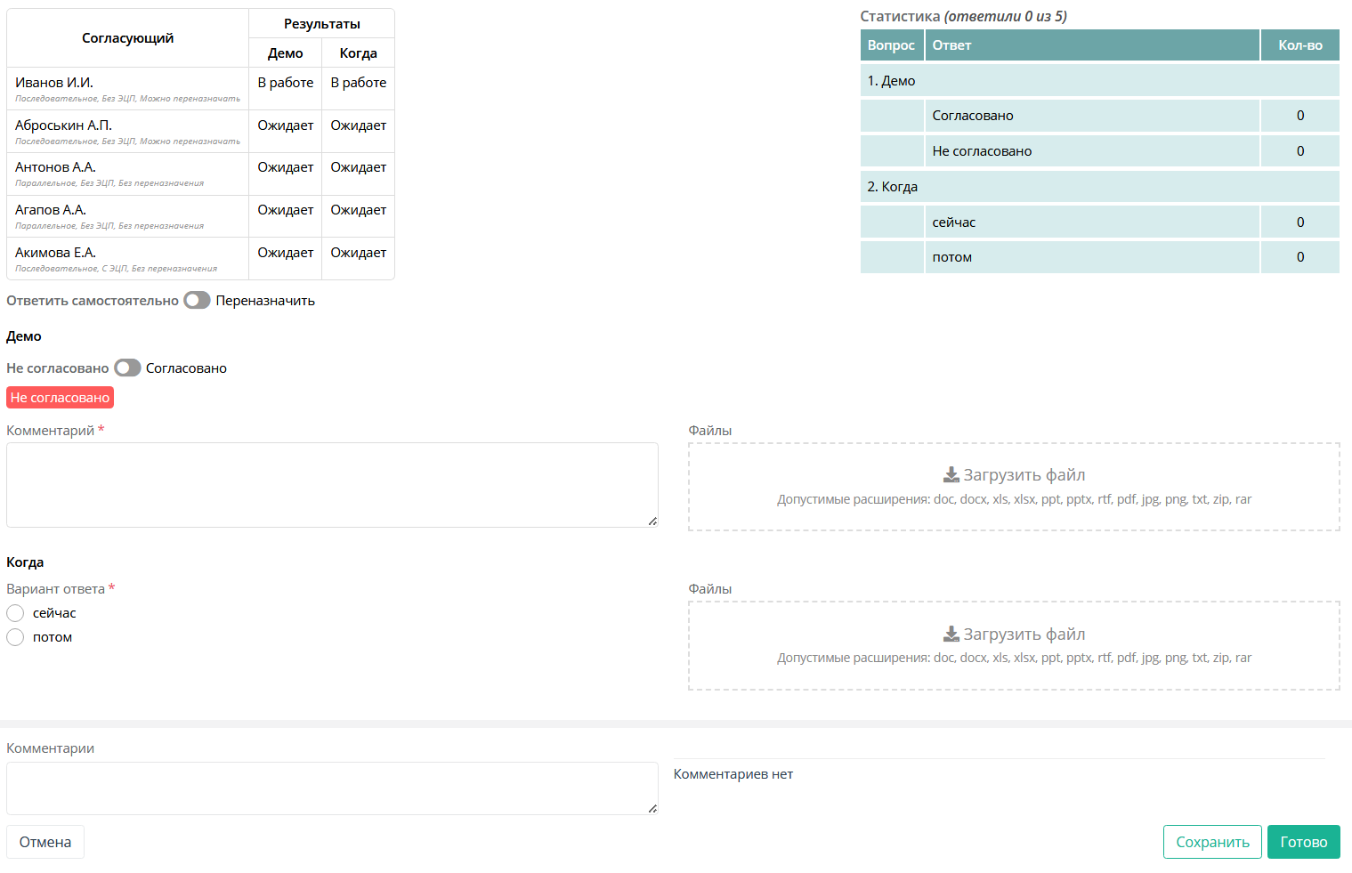 — согласующий: по ФИО или по принадлежности к роли/отделу
