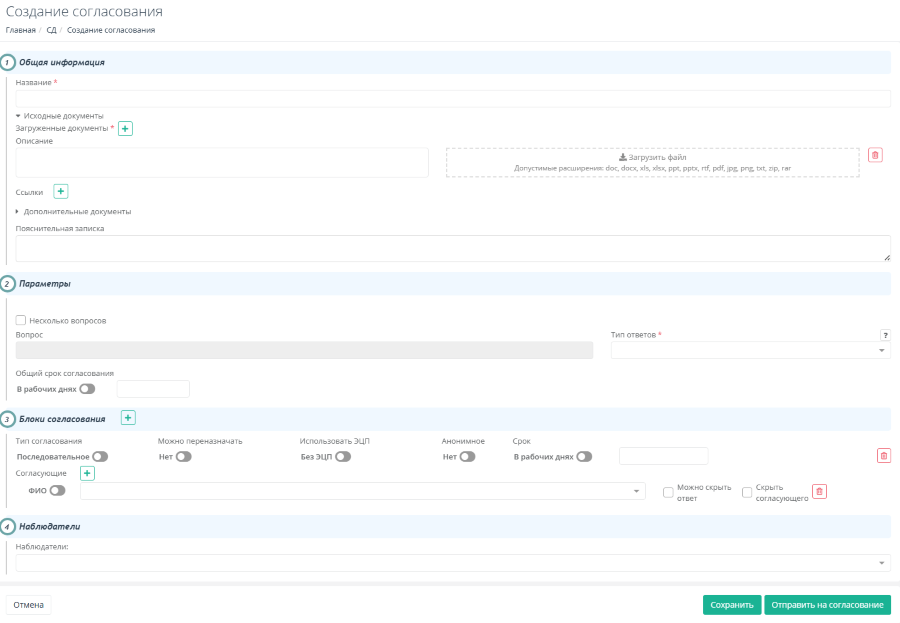 — выбор наблюдателей: сотрудников, которые смогут отслеживать процесс согласования